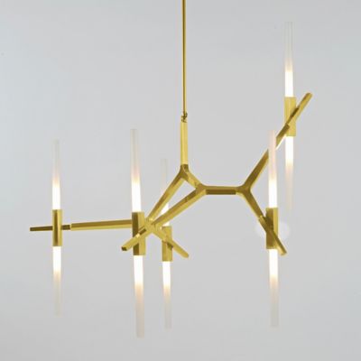 The Modo 3 Sided Chandelier - 10 Globes by Roll & Hill is a simple and innovative piece that draws from mundane objects to present an elegant statement. Designed by Jason Miller, this chandelier is inspired by the off-the-shelf industrial parts that are found in lighting stores for inexpensive light fixtures. That concept is reimagined using high-end American-made parts engineered from custom CNC-milled solid aluminum and fine handblown glass containing integrated LEDs.